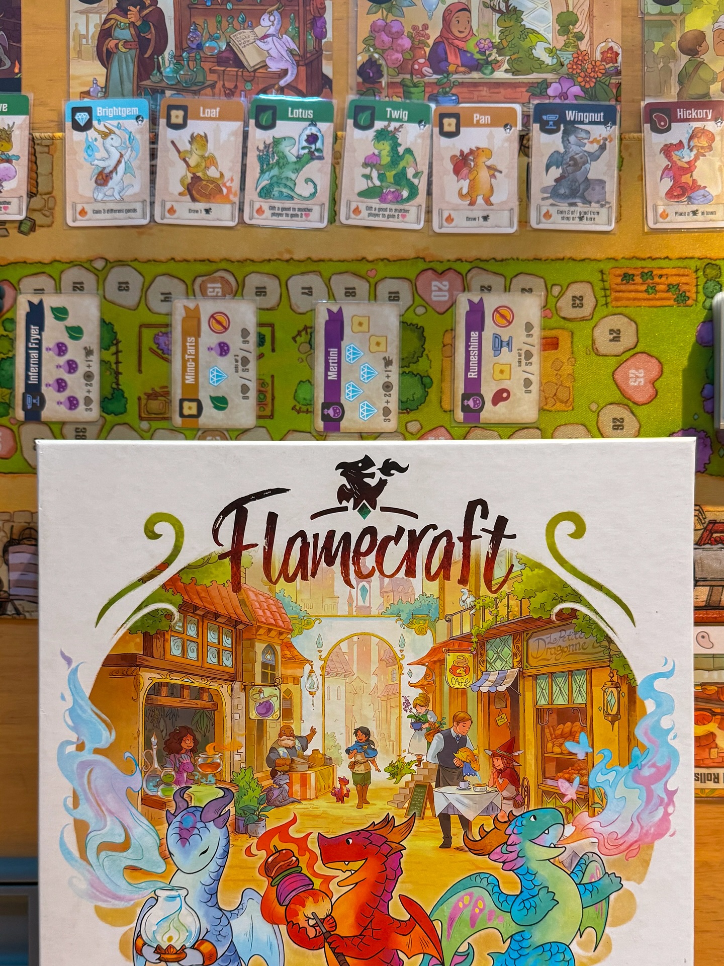 Điểm gây ấn tượng mạnh mẽ nhất của Flamecraft ngay từ cái nhìn đầu tiên chính là phần hình ảnh cực kỳ nịnh mắt. Quên đi hình ảnh những con rồng hung tợn trong truyền thuyết, thế giới của Flamecraft đưa chúng ta đến với một thị trấn yên bình, nơi những chú rồng nhỏ nhắn, đáng yêu được gọi là rồng nghệ sĩ đang chung sống hòa bình cùng con người. Từ những lá bài được minh họa tỉ mỉ bởi họa sĩ Sandara Tang cho đến tấm thảm chơi bằng chất liệu neoprene cao cấp, mọi thứ đều toát lên vẻ chỉn chu và cao cấp, khiến ngay cả những người mới tập chơi cũng phải thốt lên vì quá dễ thương