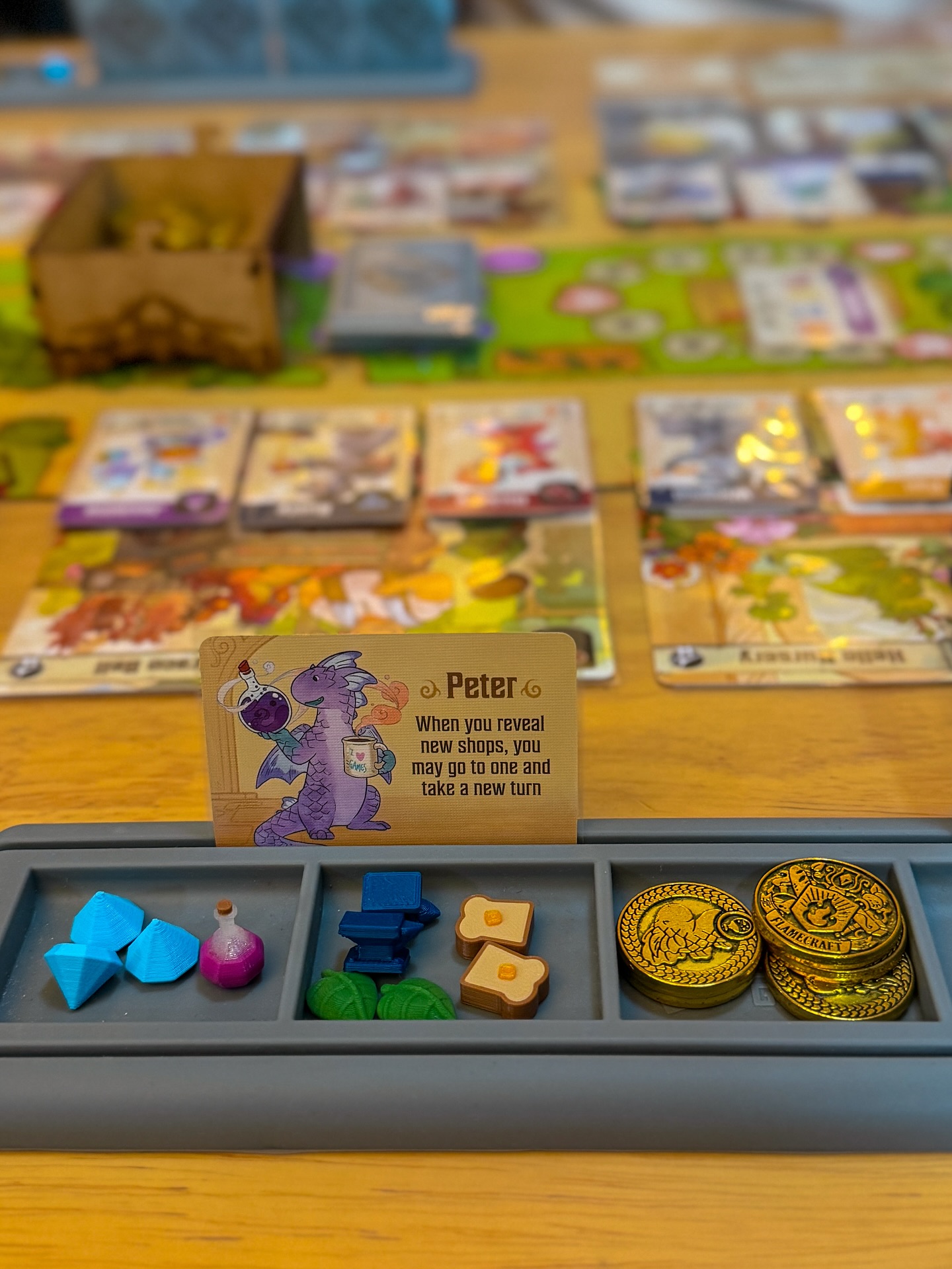 Lối chơi của Flamecraft xoay quanh việc quản lý tài nguyên và tối ưu hóa vị trí đặt công nhân vô cùng thông minh. Trong mỗi lượt, bạn sẽ di chuyển chú rồng của mình đến một cửa hàng trong thị trấn để thực hiện một trong hai hành động: Thu thập hoặc Phù phép. Khi thu thập, bạn nhận được các nguyên liệu như bánh mì, pha lê, hay sắt thép từ cửa hàng đó, đồng thời có thể đặt thêm một chú rồng mới vào để giúp cửa hàng nâng cấp khả năng sản xuất. Nếu chọn Phù phép, bạn sẽ dùng tài nguyên đã tích lũy để nâng cấp cửa hàng vĩnh viễn, từ đó kiếm về một lượng điểm danh tiếng khổng lồ. Điểm tinh tế ở đây là mỗi khi bạn nâng cấp một địa điểm, những người chơi sau cũng sẽ được hưởng lợi, tạo nên một sự tương tác cộng hưởng đầy thú vị và văn minh trên bàn chơi.