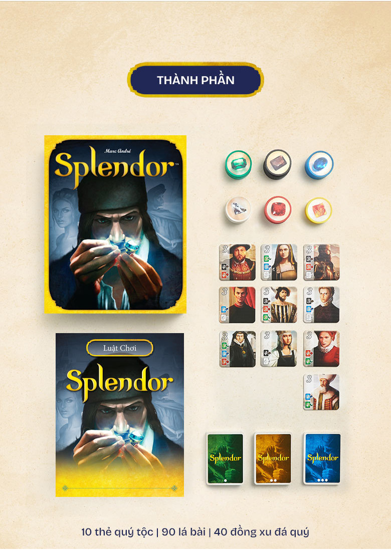 Splendor là một trò chơi board game đẳng cấp được thiết kế bởi Marc André và phát hành vào năm 2014 bởi Space Cowboys. Đây là một trò chơi chiến thuật thu thập tài nguyên dành cho 2-4 người chơi, với thời gian chơi khoảng ⏱️ 30 phút. Trò chơi đã giành được nhiều giải thưởng danh giá 🏆, bao gồm Golden Geek Best Family Board Game và được đề cử cho giải Spiel des Jahres 2014.