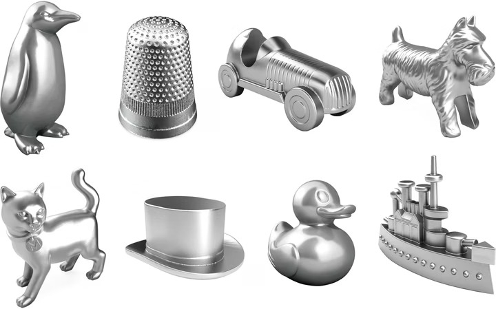 - 8 Token (biểu tượng người chơi bằng kim loại, ví dụ: chó Scottie, xe đua, mũ cao bồi...)