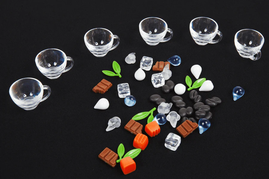 Các nguyên liệu dạng mô hình — lưu trữ trong khay riêng, rất đáng yêu và mang tính “cảm giác chạm” ấn tượng.