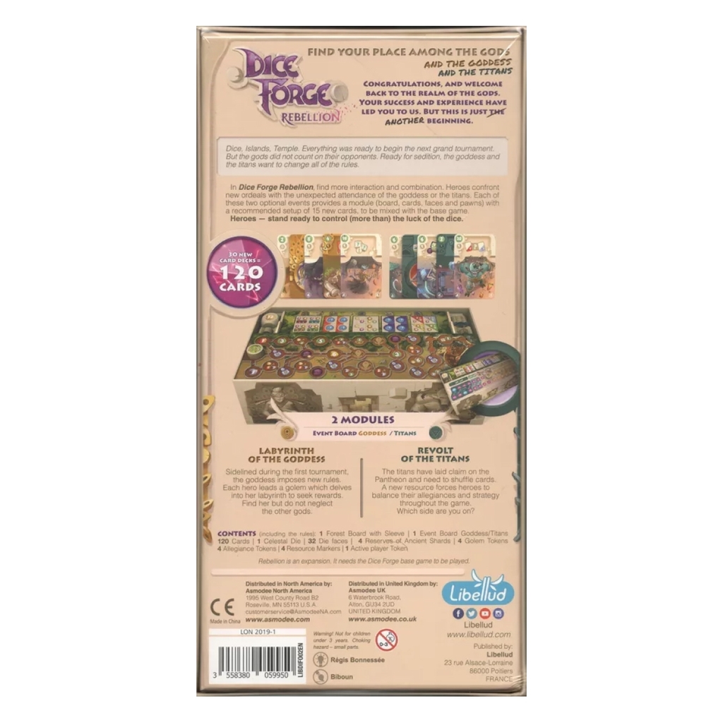 Dice Forge: Rebellion là bản mở rộng, yêu cầu người chơi phải có trò chơi gốc Dice Forge để trải nghiệm. Bản mở rộng này giới thiệu các thẻ Heroic Feat mới, mặt xúc xắc mới và hai mô-đun tùy chọn: Labyrinth of the Goddess và Revolt of the Titans.