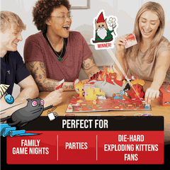 Exploding Kittens: The Board Game là phiên bản board game (trò chơi trên bảng) nối tiếp series thẻ bài nổi tiếng, nơi người chơi cố gắng di chuyển đến cuối đường đua mà không nhảy trúng “Exploding Kitten” (Mèo phát nổ). Tuyệt vời hơn nữa, trò chơi có một cơ chế "lật bảng" (flip the board) — một khi board lật, lối đi hoàn toàn thay đổi và mỗi bước đi từ đó có thể đưa bạn đến... “vỡ tung”! Trò chơi đòi hỏi chiến thuật, khả năng phản đòn bạn bè và một chút may rủi để chiến thắng.