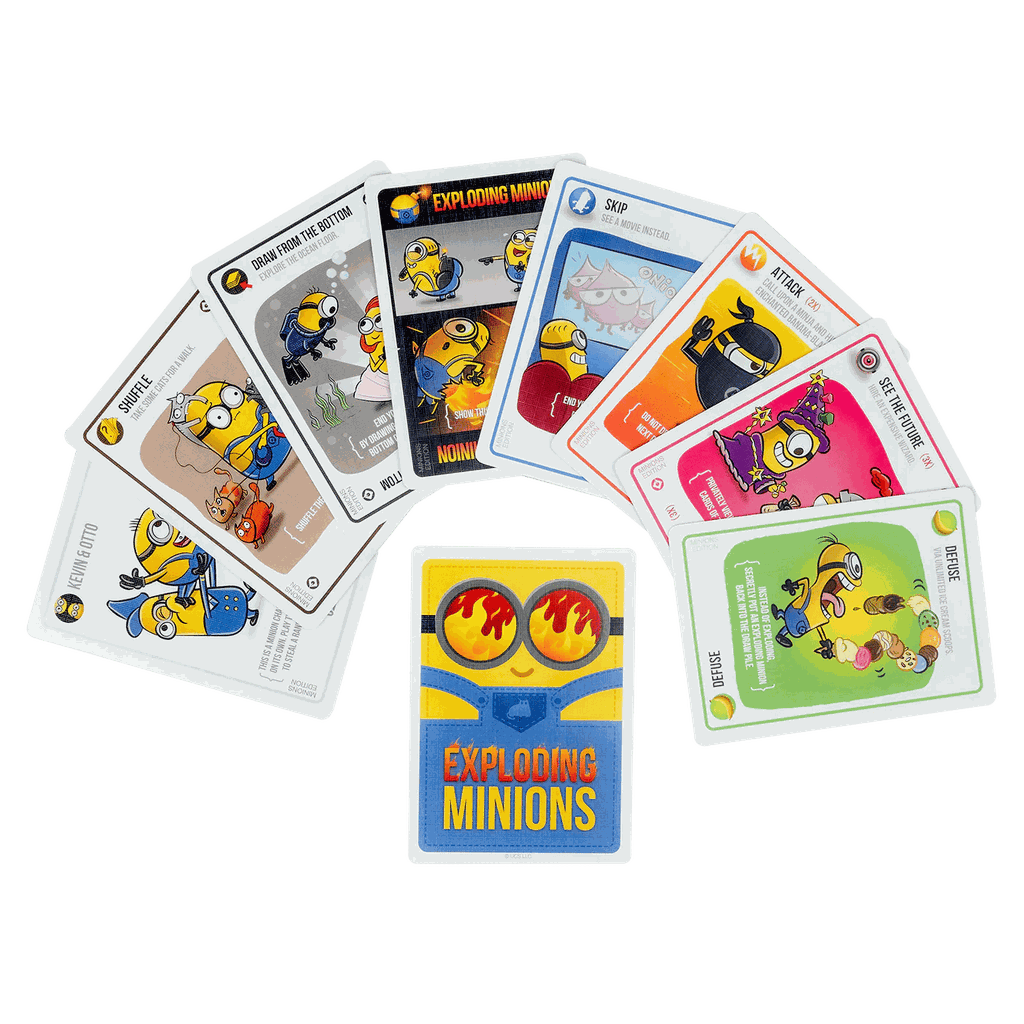 Exploding Minions là một phiên bản Exploding Kittens lấy chủ đề Minions, nổi bật với những lá bài thay đổi trò chơi hoàn toàn mới và những quả chuối ma thuật. Đây là một trò chơi thẻ bài dành cho những người yêu thích chuối, kỳ lân rực lửa và đôi khi cả vòi cứu hỏa. Mục tiêu cơ bản của trò chơi là tránh rút phải một lá bài Exploding Minions. Bạn chơi bằng cách rút bài từ chồng bài úp mặt xuống cho đến khi ai đó rút phải lá bài Exploding Minions. Người rút phải lá bài đó sẽ "nổ tung" và bị loại khỏi trò chơi. Tất cả các lá bài khác trong trò chơi sẽ giúp bạn tránh rút phải Exploding Minions. Trò chơi tiếp tục cho đến khi chỉ còn một người chơi duy nhất chưa nổ tung, và người đó sẽ giành chiến thắng. Về cơ bản, nếu bạn nổ, bạn thua; nếu bạn không nổ, bạn thắng.