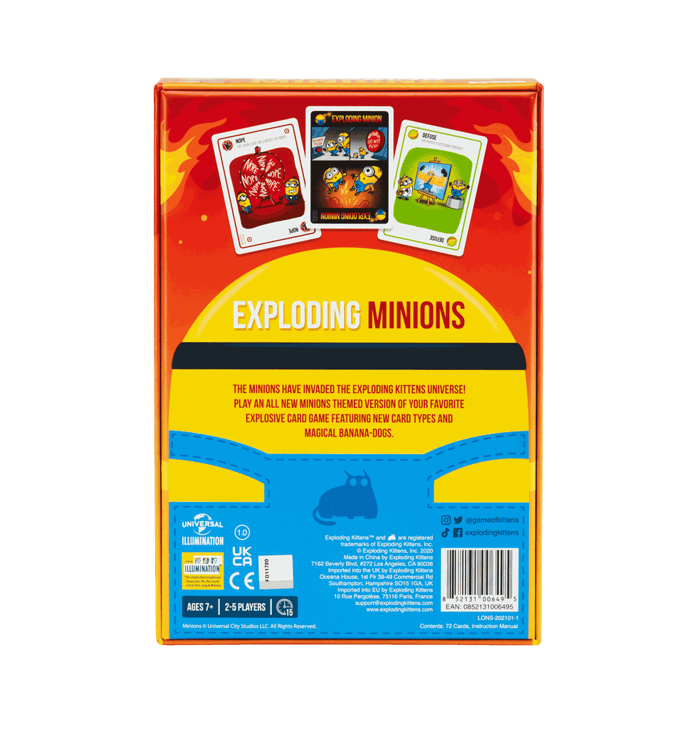 • Lưu ý: Exploding Minions có mặt sau lá bài độc đáo nên KHÔNG THỂ kết hợp với bất kỳ bản mở rộng nào của Exploding Kittens. Hiện tại không có bản mở rộng nào dành riêng cho Exploding Minions.