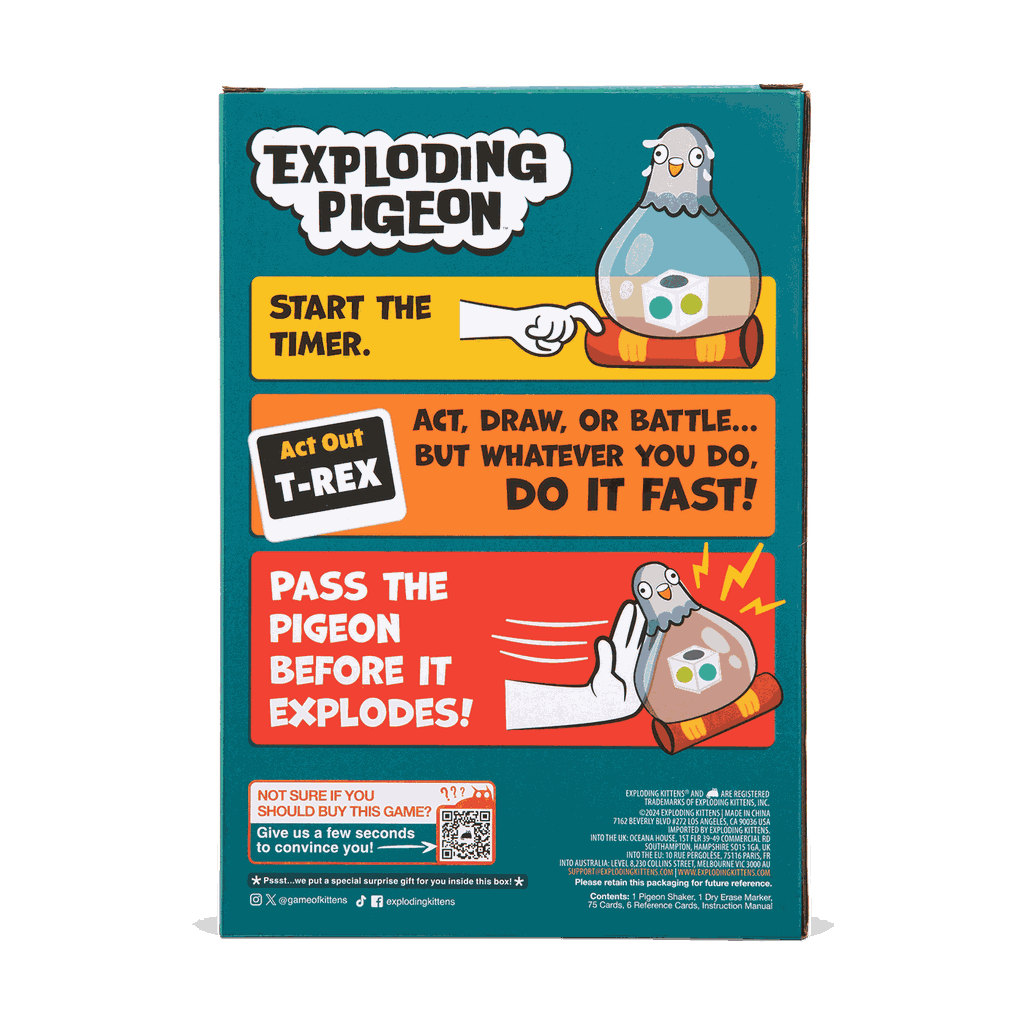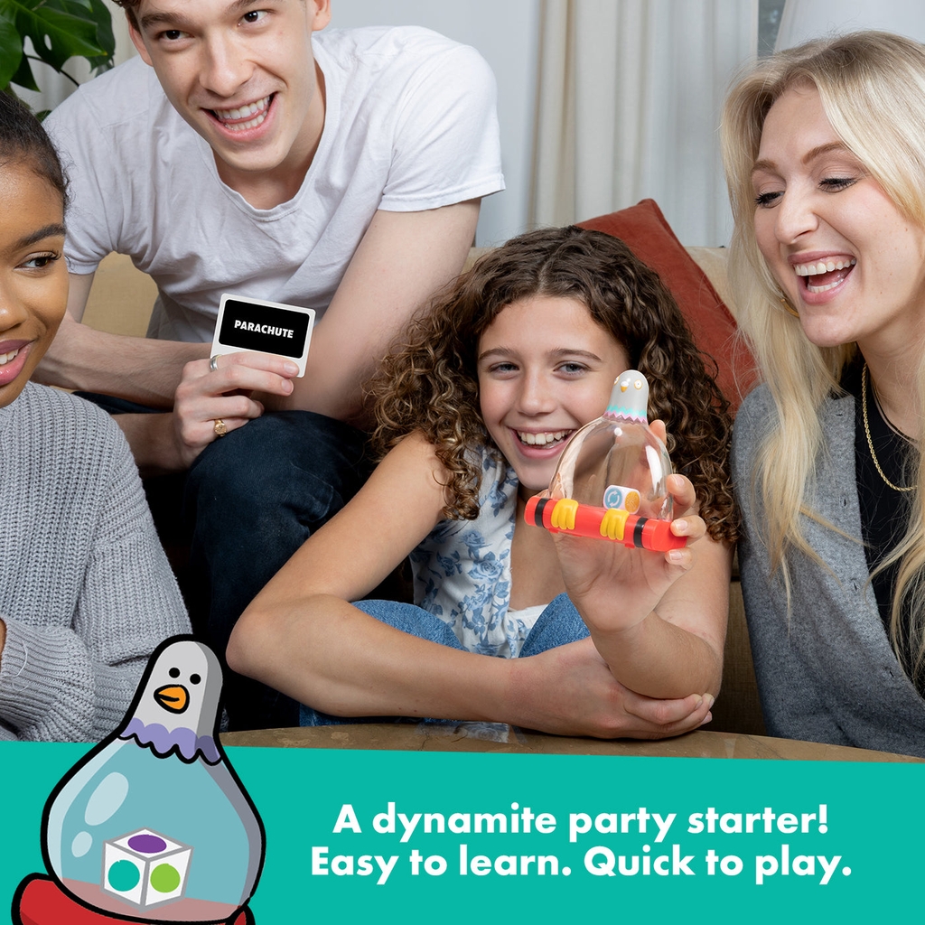 Exploding Pigeon là một trò chơi tiệc tùng cực kỳ vui nhộn, nơi bạn phải vừa hoàn thành thử thách, vừa nhanh chóng chuyền chú chim bồ câu cho người tiếp theo trước khi nó… “phát nổ”. Trò chơi kết hợp khéo léo giữa vẽ (Pictionary), diễn xuất (Charades) và thử thách đối kháng theo kiểu “hot potato”, tạo nên nhịp độ nhanh, căng thẳng nhưng tràn ngập tiếng cười. Với lối chơi đơn giản, dễ tiếp cận và đầy bất ngờ, Exploding Pigeon là lựa chọn hoàn hảo cho mọi buổi tụ tập gia đình, bạn bè hay team building.