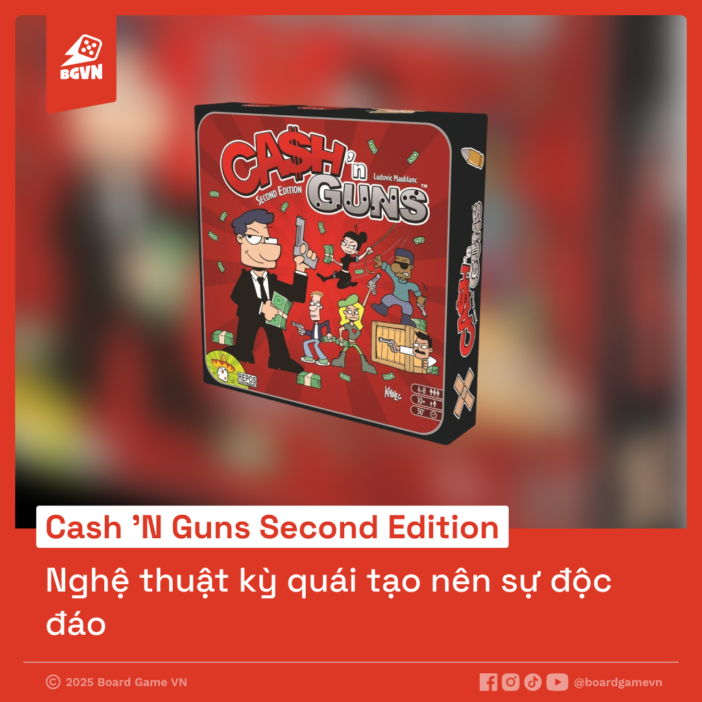 Tổng quan Cash 'N Guns Second Edition là một trò chơi board game thuộc thể loại party game, money heist, và strategy board game. Trò chơi mô phỏng một cuộc chia chác chiến lợi phẩm đầy hỗn loạn sau một vụ cướp thành công. Người chơi sẽ vào vai những tên cướp sử dụng súng xốp để đe dọa, lừa bịp và cạnh tranh lẫn nhau để giành lấy phần lớn nhất.