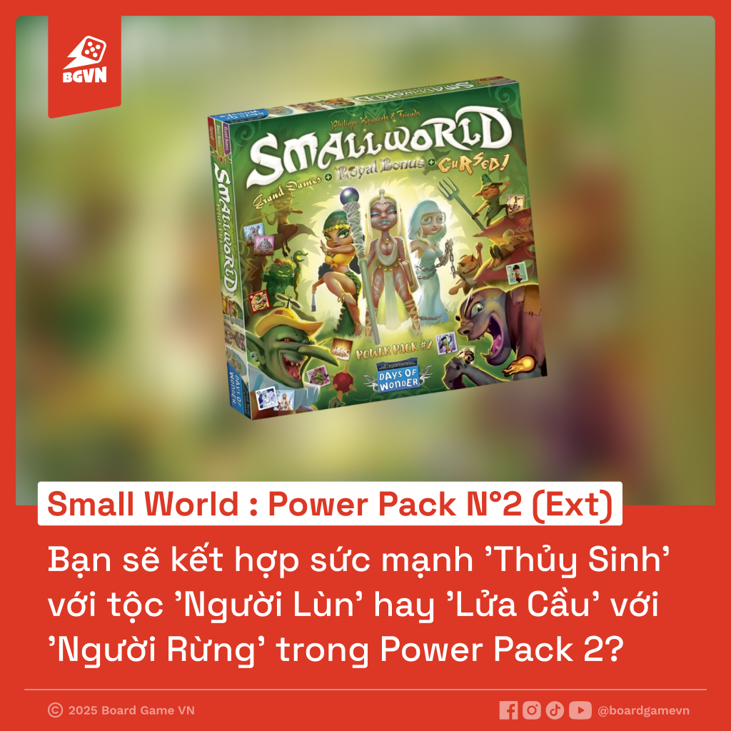 Small World - Power Pack 2 là một bản mở rộng cho trò chơi board game chiến thuật nổi tiếng Small World. Bản mở rộng này được phát hành bởi Days of Wonder và mang đến nhiều nội dung mới để làm phong phú thêm trải nghiệm chơi Small World. Điểm đặc biệt của Power Pack 2 là nó kết hợp tất cả các Chủng tộc (Races) và Sức mạnh Đặc biệt (Special Powers) từ ba bản mở rộng nhỏ trước đó, bao gồm ***Cursed!***, Grand Dames of Small World, và Royal Bonus. Điều này giúp người chơi dễ dàng tiếp cận một lượng lớn nội dung mới mà trước đây có thể khó tìm mua lẻ.