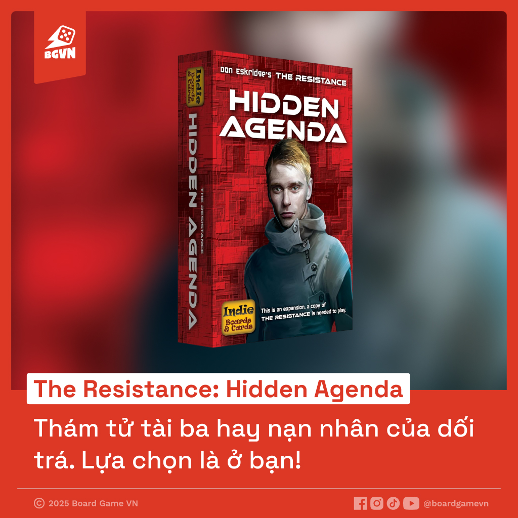 - The Resistance: Hidden Agenda là một bản mở rộng của trò chơi The Resistance, một trò chơi suy luận xã hội và lừa dối, trong đó người chơi bí mật đóng vai trò là thành viên của phe Kháng chiến hoặc phe Gián điệp. Mục tiêu của Kháng chiến là hoàn thành thành công ba nhiệm vụ, trong khi mục tiêu của Gián điệp là làm cho ba nhiệm vụ thất bại hoặc ám sát Chỉ huy Kháng chiến.