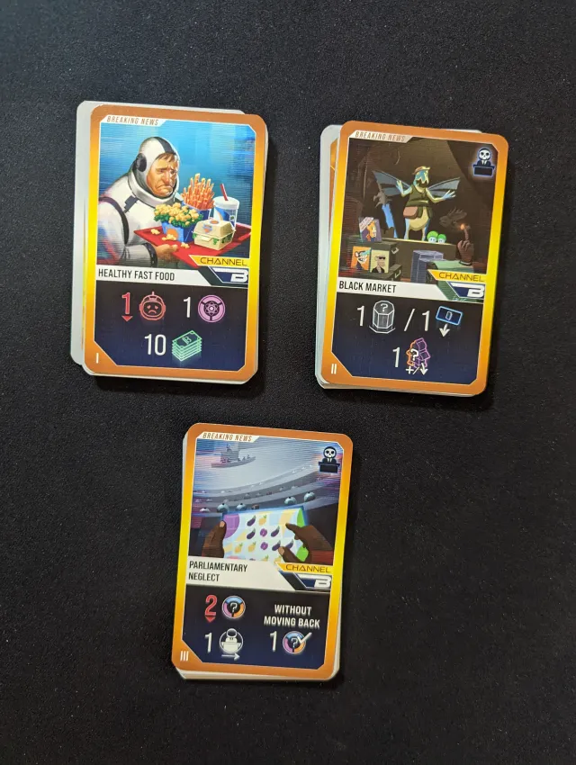Thẻ bài tin tức: Mỗi thẻ bài đại diện cho một sự kiện có thể ảnh hưởng đến trò chơi, cung cấp tiền, điểm chiến thắng, phiếu bầu hoặc các hiệu ứng đặc biệt khác....