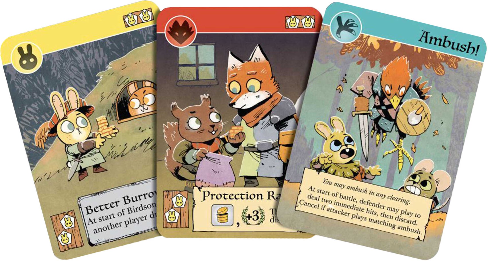 - Ô (Clearing): Bảng chơi được chia thành 12 ô, được nối với nhau bằng các con đường. Mỗi ô có một biểu tượng sinh vật (thỏ, cáo, hoặc chuột).