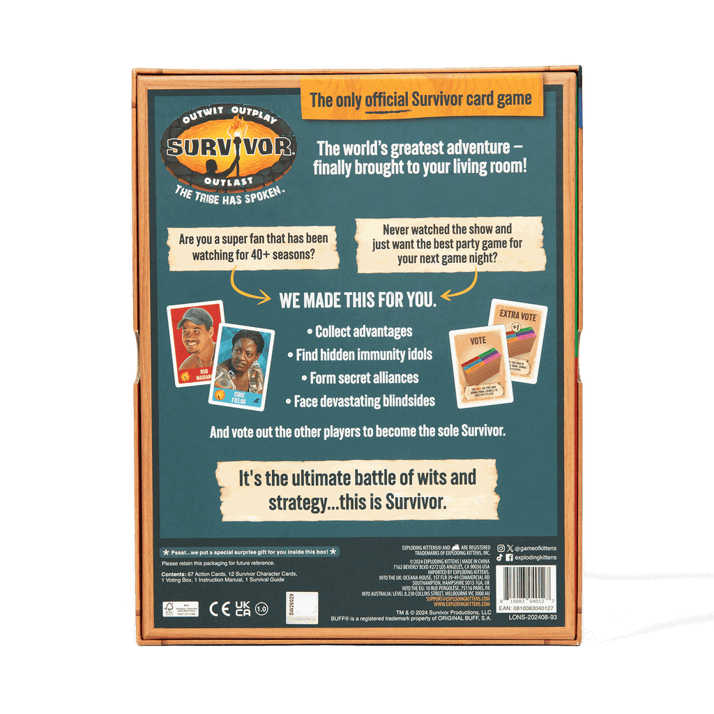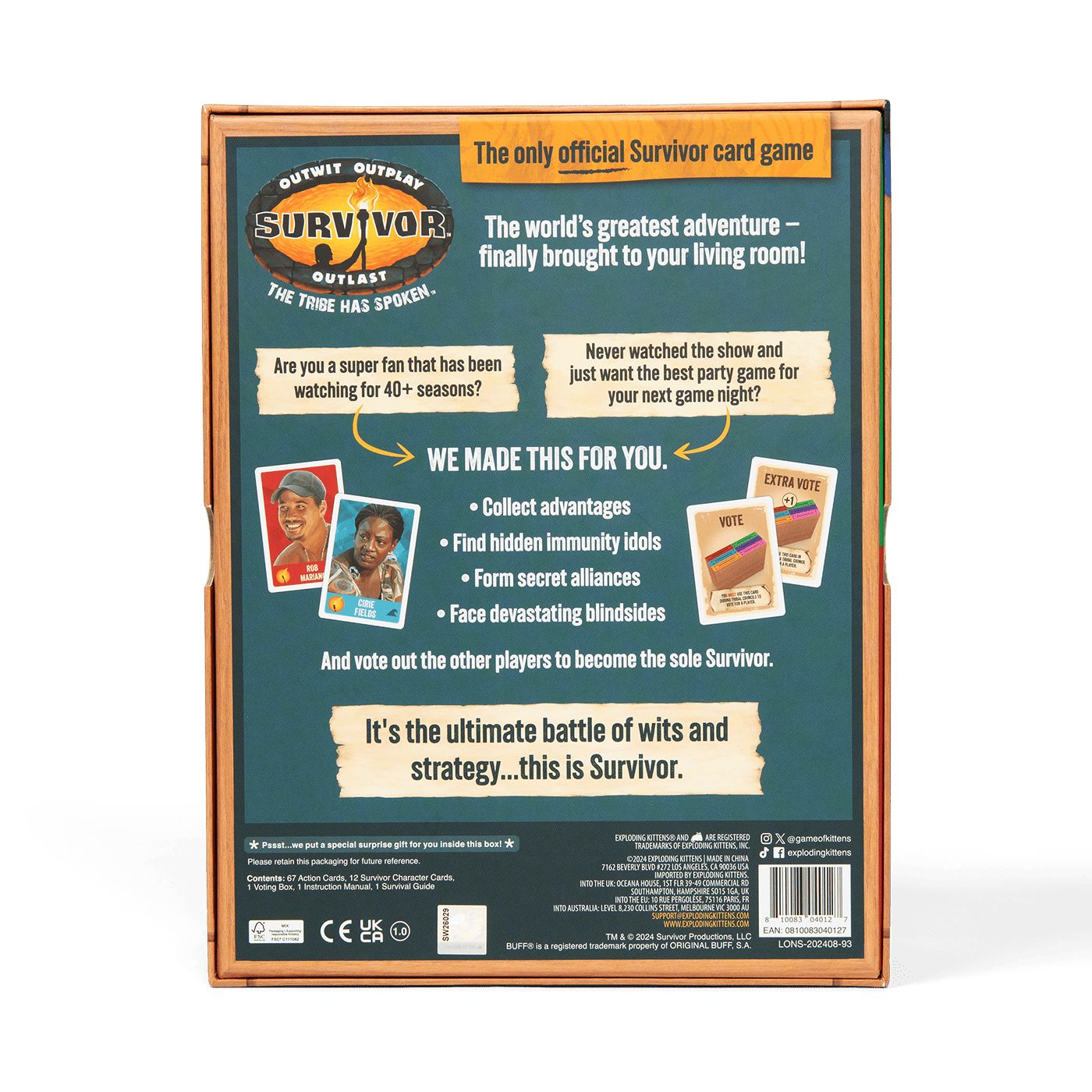Trò chơi được phát triển bởi Exploding Kittens dưới sự hợp tác cùng Jeff Probst – MC gắn liền với thương hiệu Survivor. Với lối chơi giàu tính tương tác, vừa kịch tính vừa bất ngờ, đây là lựa chọn hoàn hảo cho những ai yêu thích chiến thuật, thương thuyết và những màn lật kèo kịch tính.