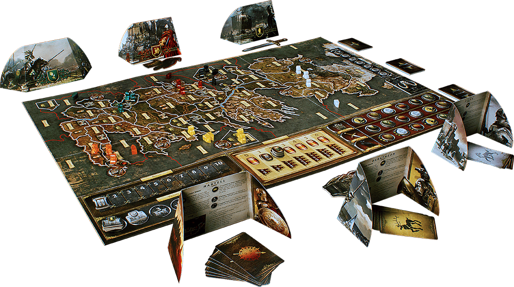 Thiết lập trò chơi: Trò chơi diễn ra trên một bản đồ chia lục địa Westeros thành nhiều khu vực. Hầu hết các khu vực đều có ít nhất một biểu tượng đại diện cho thành phố, pháo đài, thùng tiếp tế (support barrel) hoặc biểu tượng sức mạnh (power icon). Mỗi người chơi chọn một Gia Tộc để bắt đầu, đặt các đơn vị quân khởi đầu lên bản đồ, đặt các đánh dấu Gia Tộc lên các đường theo dõi "Supply" (Tiếp tế) và ba đường theo dõi "Influence" (Ảnh hưởng). Ba bộ bài Westeros được xáo trộn và đặt sang một bên, cùng với bộ bài Wildlings (Man Tộc) và token "Wildling threat".