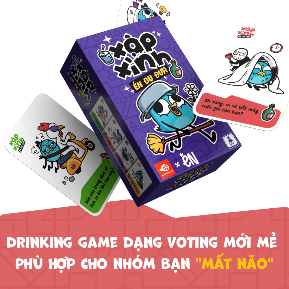 Én là một trong những cái tên quen thuộc trong cộng đồng comic Việt, từng gây bão mạng xã hội với màn “tranh đấu” cùng Thỏ Bảy Màu vào 9/2020. Thành lập từ năm 2018, đến nay fanpage Én đã sở hữu hơn nửa triệu lượt theo dõi, được nhiều bạn trẻ yêu thích bởi những câu chuyện hài hước xoay quanh sự “mất não” của nhân vật. Kết hợp với Én lần này Board Game Việt Nam hân hạnh đưa tới các bạn fan một bộ drinking game “mất não" không kém mang tên Xập Xình - Én Đu Đưa. Với tiêu chí “Bạn là nhất, bạn XẬP tất”, bộ game dành riêng cho các nhóm bạn siêu lầy hơn với các artwork siêu hề!